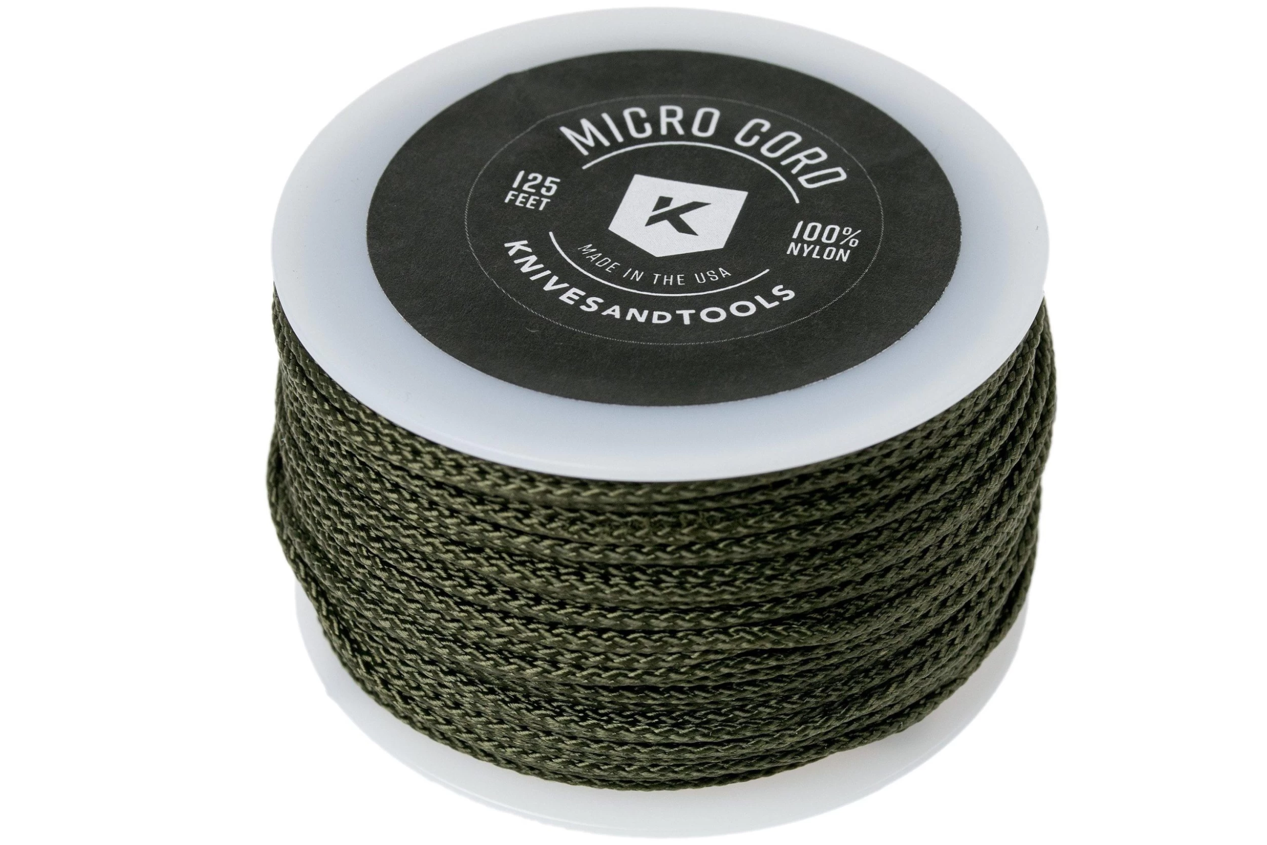 Knivesandtools Micro Cord Knivesandtools Micro Cord Made in USA is a practical tool for various purposes. Micro Cord is in fact paracord, but without the strands in the middle. So only the braided casing. What remains is a strong piece of rope with a tractive force of approximately 80/90 pounds (36/40 kg) and a diameter of only 1.12 mm. This Micro Cord is added to a choil and has a total length of 125 ft (38.1 meters).