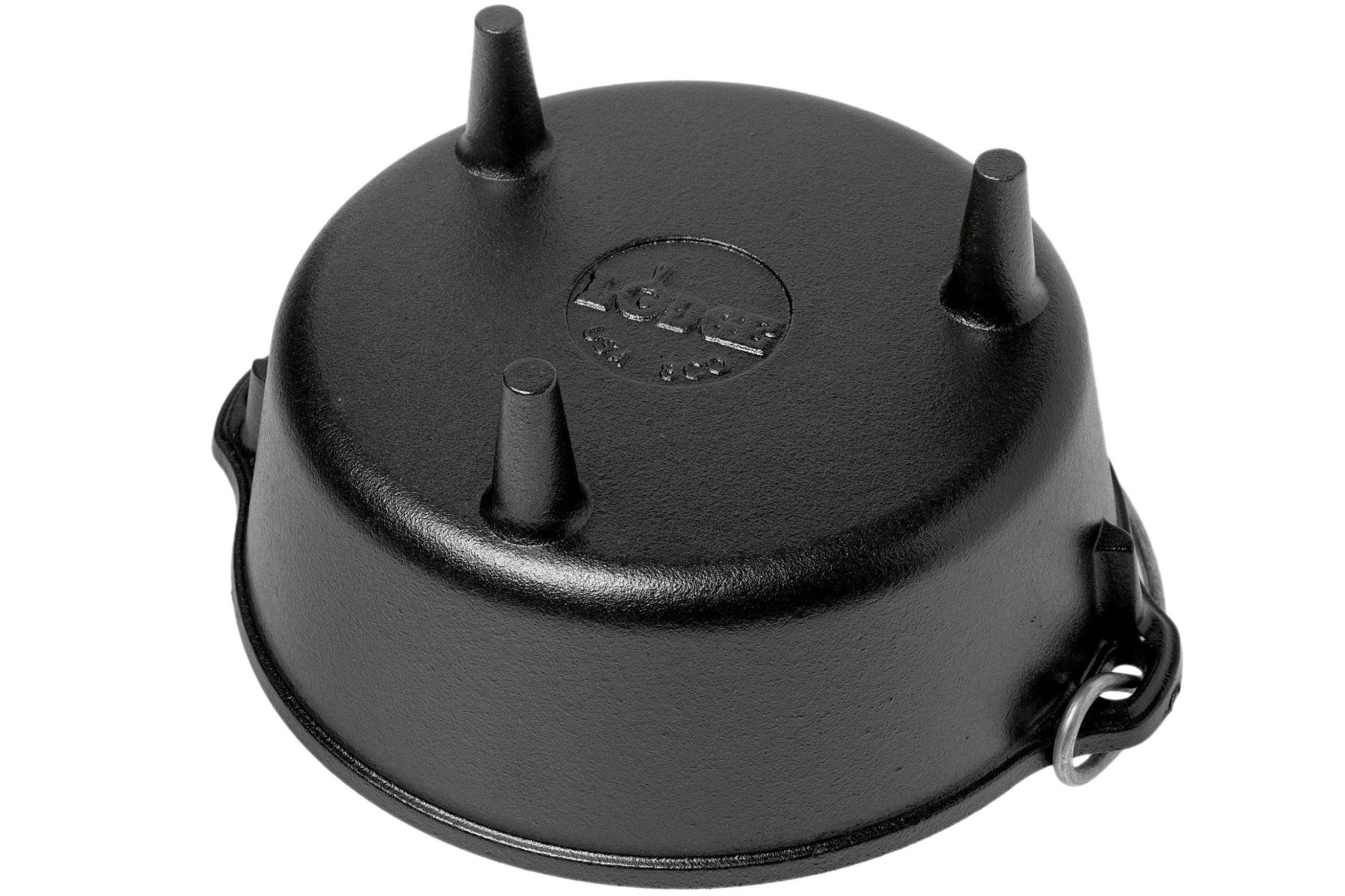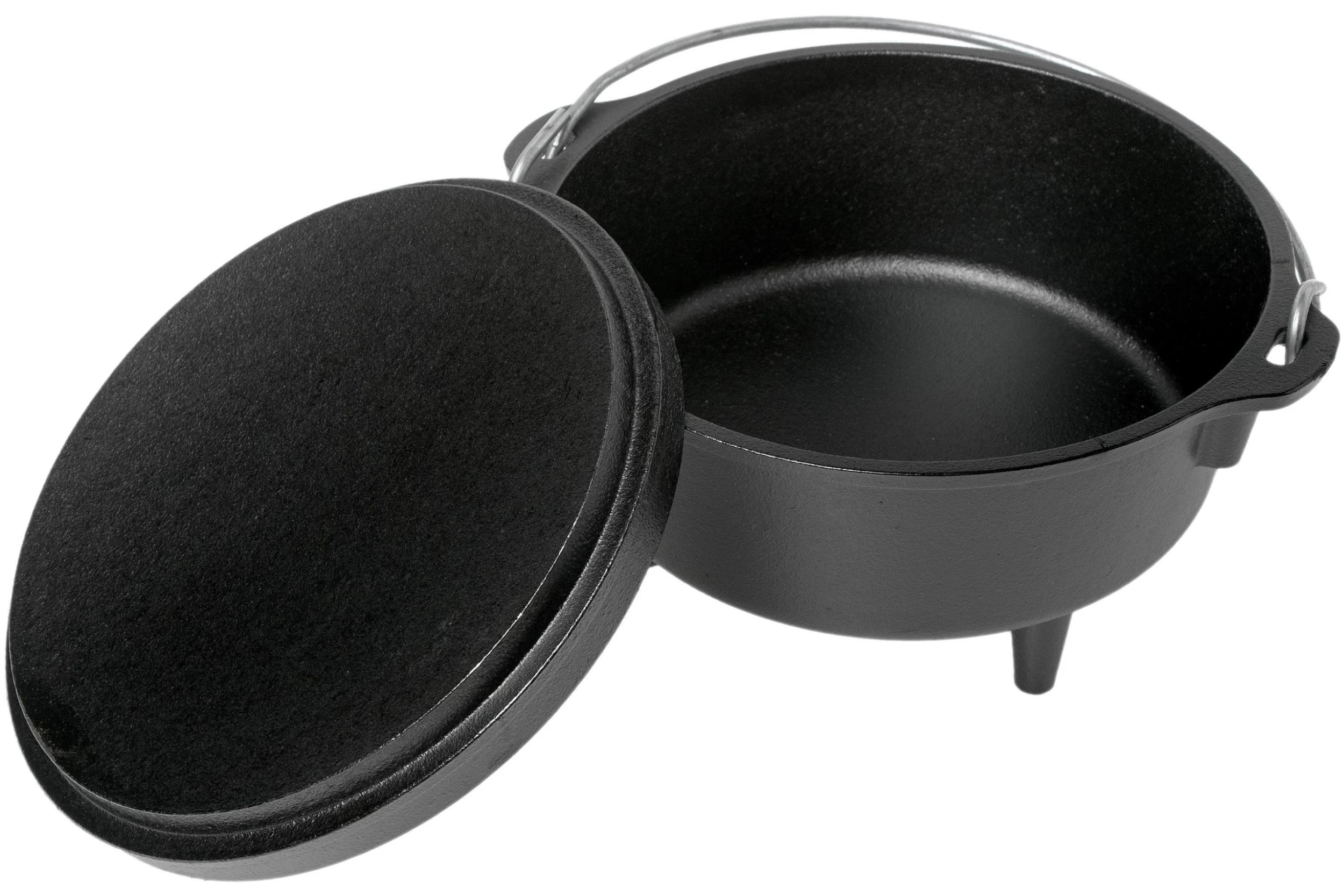 This Lodge Dutch Oven (shallow) with lid can do it all. Use it on the stove, in the oven, or over an open flame. You can stack hot coals on top of the lid, or turn the lid over and use it as a baking dish. For high heat simply place the pan on top of hot coals. Because of the feet it will always be at the right height. Do you prefer slow cooking? If so hang the pan over an open flame using a tripod! The cast-iron retains the heat well and perfectly distributes it.