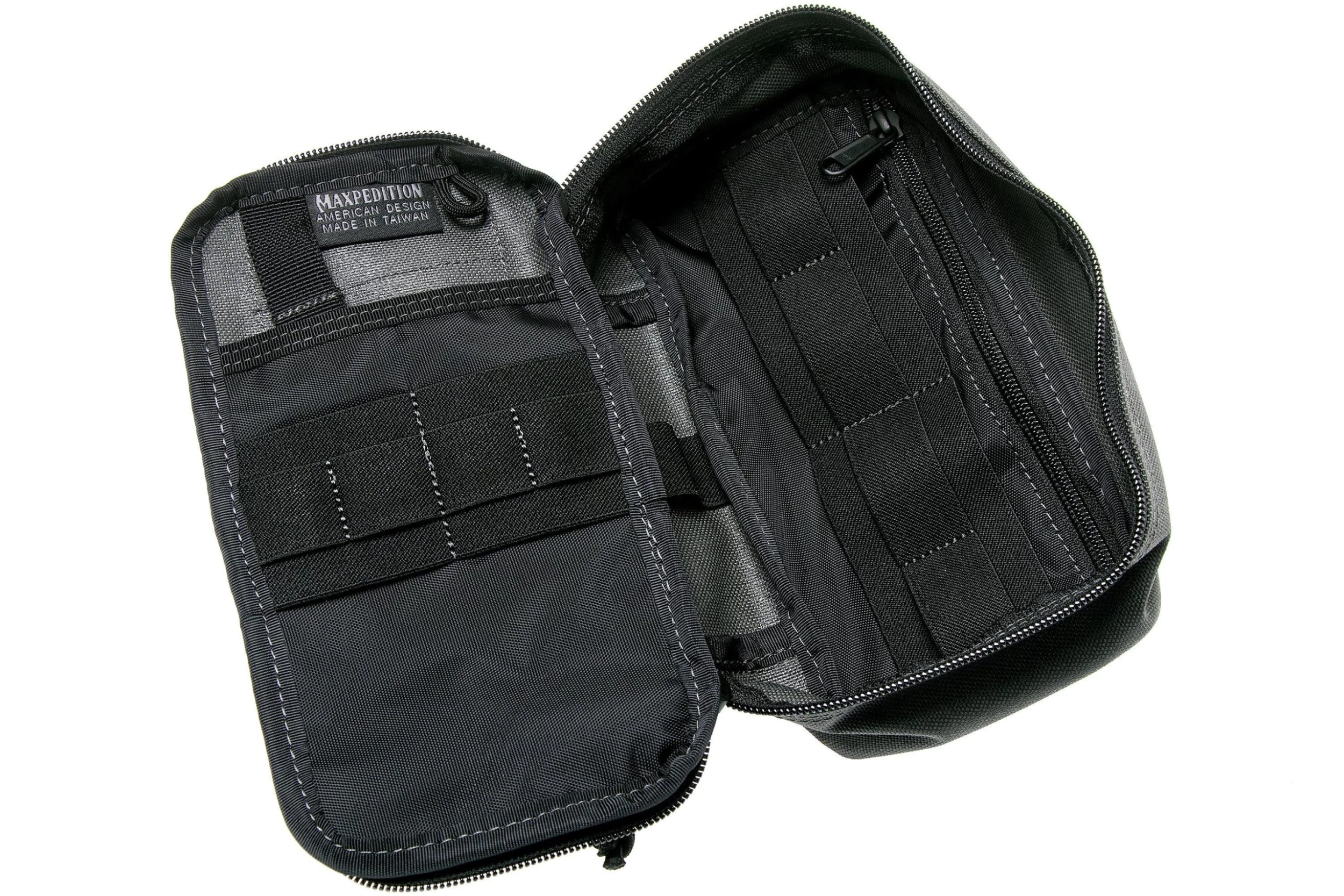 The grey Maxpedition Skinny Pocket Organizer Pouch offers you room to organize your daily gear and is easy take with you. You can individually carry this pouch or attach it to your Maxpedition bag because the pouch is MOLLE compatible. The large front compartment with velcro mount and the large carrier strap are characterizing for this pouch. The front also has a part with velcro on which you can attach patches.