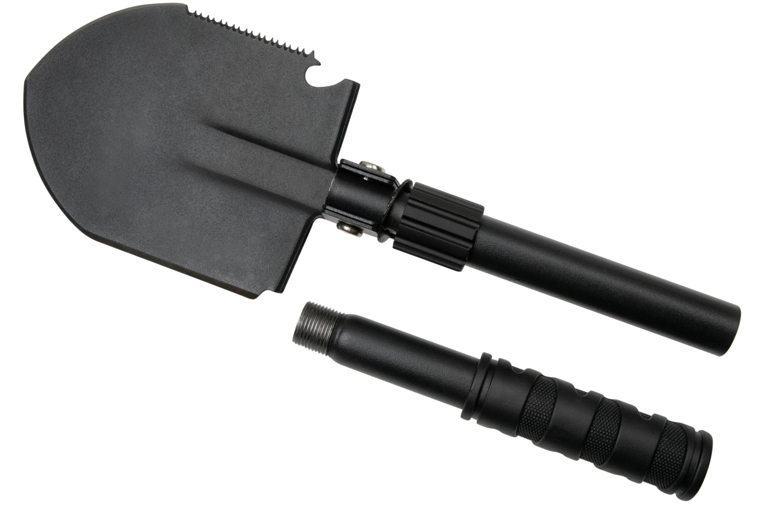 The Off Grid Tools Manganese Camping Shovel is a compact folding shovel. Ideal for camping trips. The shovel has a sharp cutting edge, a serrated cutting edge, a pickaxe and a bottle opener. Because you deserve a beer after all that digging!