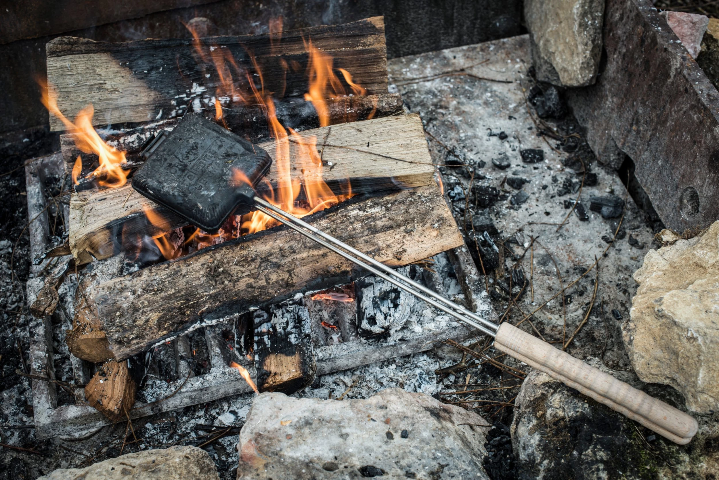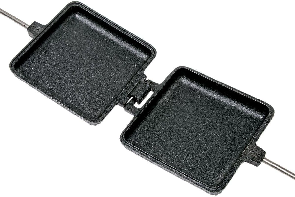 The Petromax sandwich toaster is perfect to make toast, bagels or grilled cheese sandwiches. Wonderful as a snack around the campfire or as an addition to your BBQ menu. You prepare the sandwiches in the cast-iron pans and place them over the fire. The pans can be separated thanks to the hinge. The wooden handles feel great in hand and the long stem will provide you with enough distance to the heat source. The cast-iron can immediately be used and doesn’t need to be seasoned.