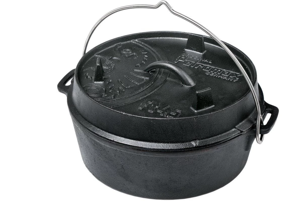 This original 4 Litres Petromax Dutch Oven ft4.5-T is perfect for outdoor use, on the BBQ or for in the oven to cook and bake. Because of the wonderful qualities of cast-iron the heat is evenly distributed and retained. Outside you can use the pan over an open flame with charcoal or briquettes. The raised edge on the lid makes it possible to add charcoal or briquettes on top of the Dutch Oven. As a result the pan is heated from all sides and will function as an oven. You can also hang the pan over an open flame or use it in the oven.