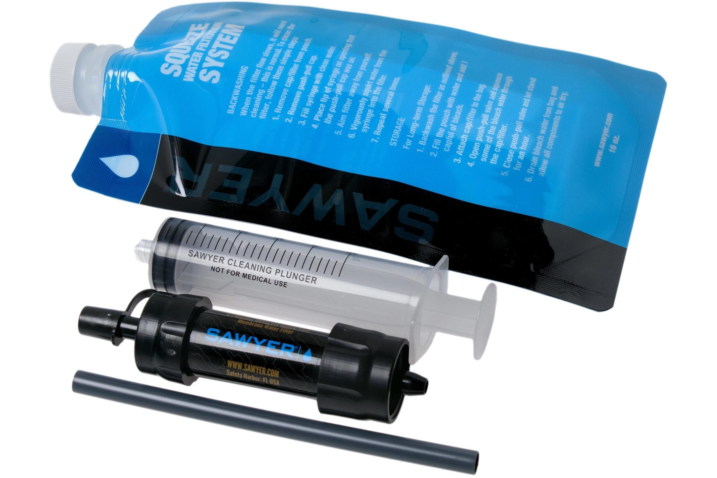 This Sawyer Mini water filter is made for hikers and bushcrafters. It is very small and super lightweight. The filter itself is 14 cm long and the entire system weighs only 65 grams. This small filter is also very versatile. You can fill the supplied water bag with the dirty water and connect the filter to it, use the straw to drink directly from the source, screw the filter onto a standard water bottle, or connect it to the hose of your water bag. It’s super easy to use!