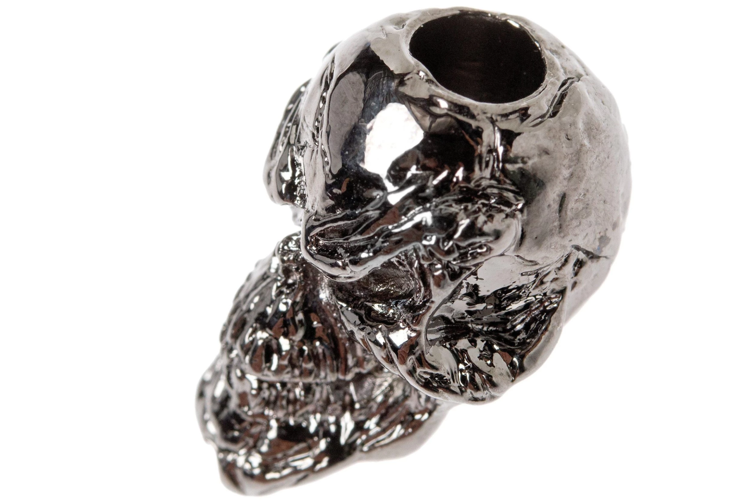 The Schmuckatelli Grins Skull Bead Hematite is a cool bead. This bead, which is made from lead-free tin, has a hematite finish. Hematite adds a nice metallic gloss, giving the bead its unique appearance. The inner size is approximately 5 mm. Perfect for paracord 550. It has room for two strands of paracord.
