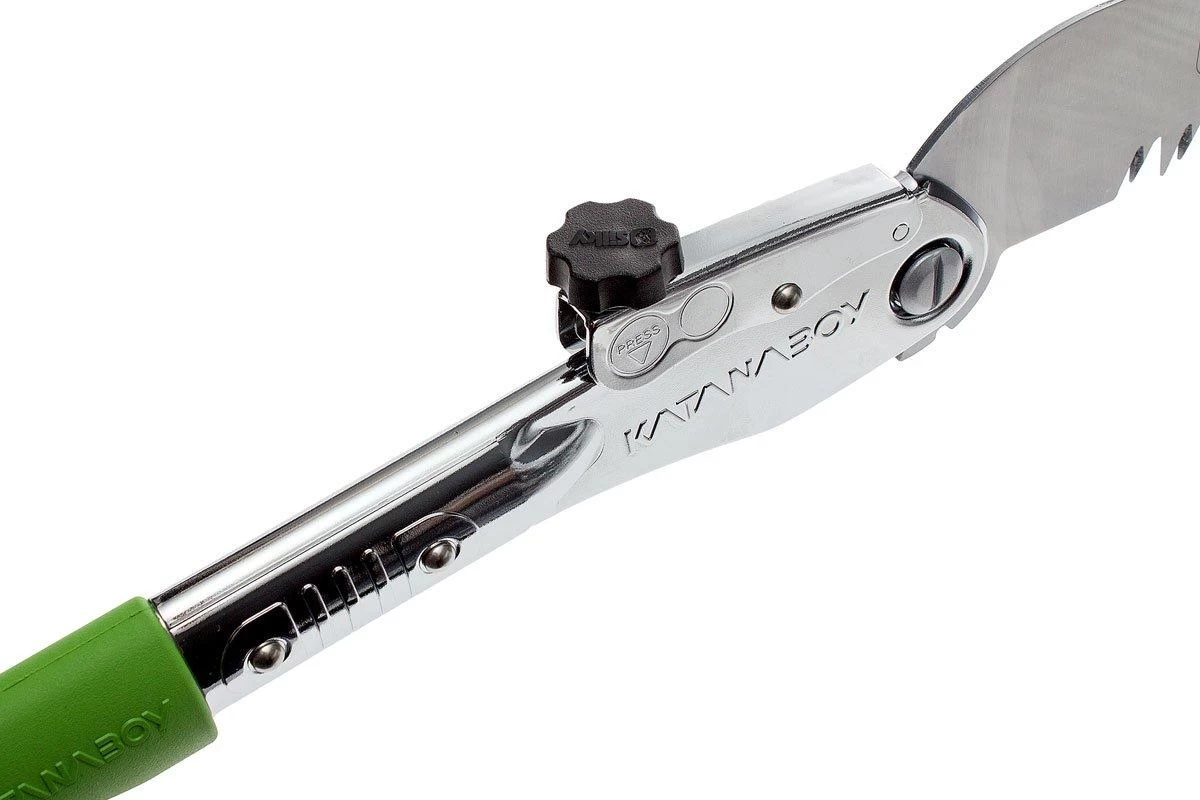 The Silky Katanaboy 650-4 extra course, black is a very large folding saw. It will bring hard to reach branches within reach. The folding saw is named after the Japanese Katana sword, partially because its unique blade length of 50 cm. Like the Katana the Katanaboy has a soft metal core. As a result it is very flexible and properly takes hold of the wood. The hard outside of the blade ensures that the blade will stay sharp for a long time.