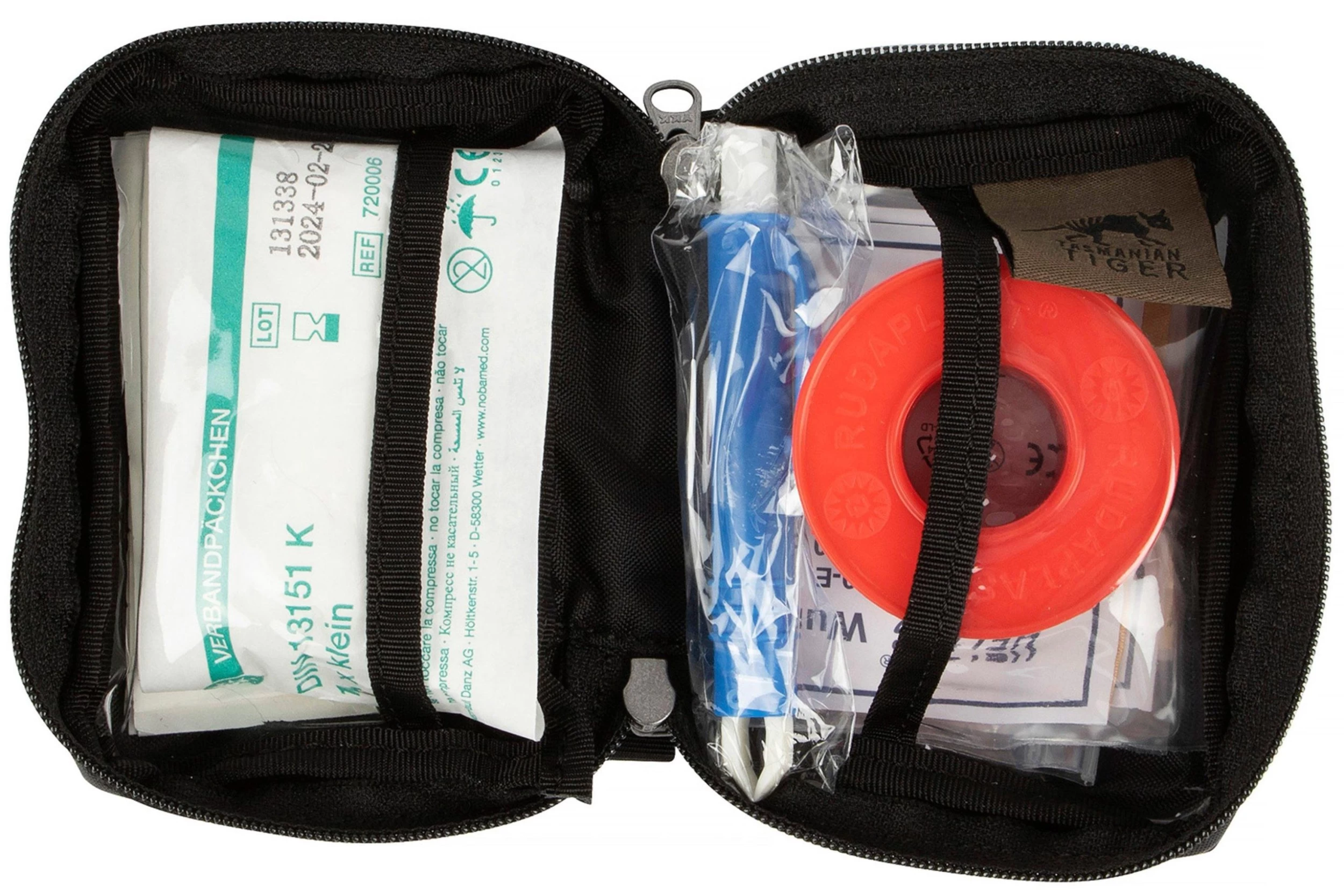This Tasmanian Tiger First Aid Mini kit is filled with all first aid basics you need when you spend time on the road. The compact pouch is enhanced with a zipper, and a main compartment in two parts. Here you will find transparent compartments on both sides. The back of the pouch is enhanced with a belt loop to make sure you can carry it vertically or horizontally on your belt or bag. The First Aid Mini is filled with: